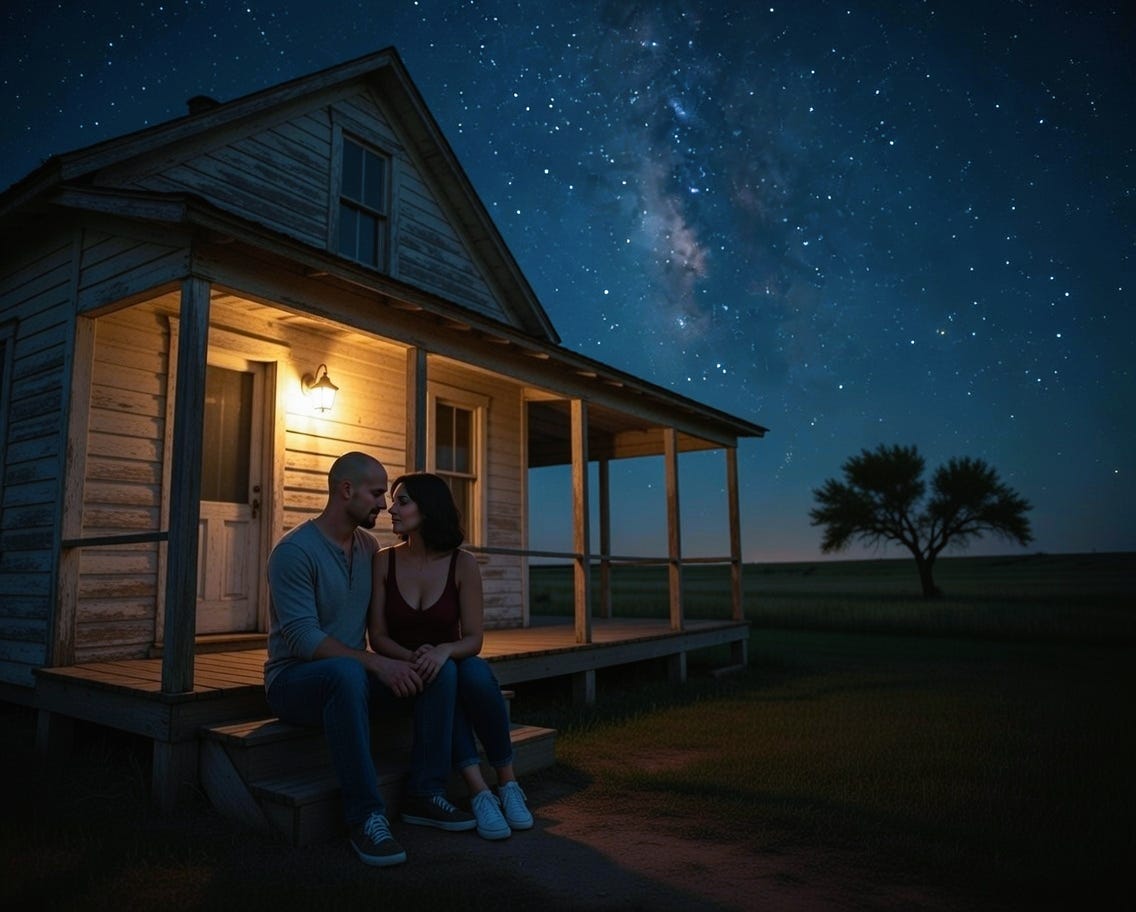 They sat together on the back steps after midnight; the sky stretched above them like a book written in a language they were only just beginning to learn. The air held that quiet electricity of things unspoken but already true, the kind of charged silence that makes your skin tingle and your breath pause.